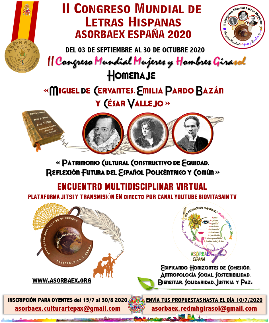 Es para mí motivo de satisfacción hacer de vuestro conocimiento que, la asociación ASORBAEX la cual presido, organiza el II CONGRESO MUNDIAL DE LAS LETRAS HISPANAS “MIGUEL DE CERVANTES Y CÉSAR VALLEJO” y II CONGRESO MUNDIAL MUJERES Y HOMBRES GIRASOL “EMILIA PARDO BAZÁN” ASORBAEX ESPAÑA 2020. Encuentro multidisciplinar virtual que tiene como lema «Patrimonio Constructivo de Equidad. Reflexión Futura del español policéntrico y común».