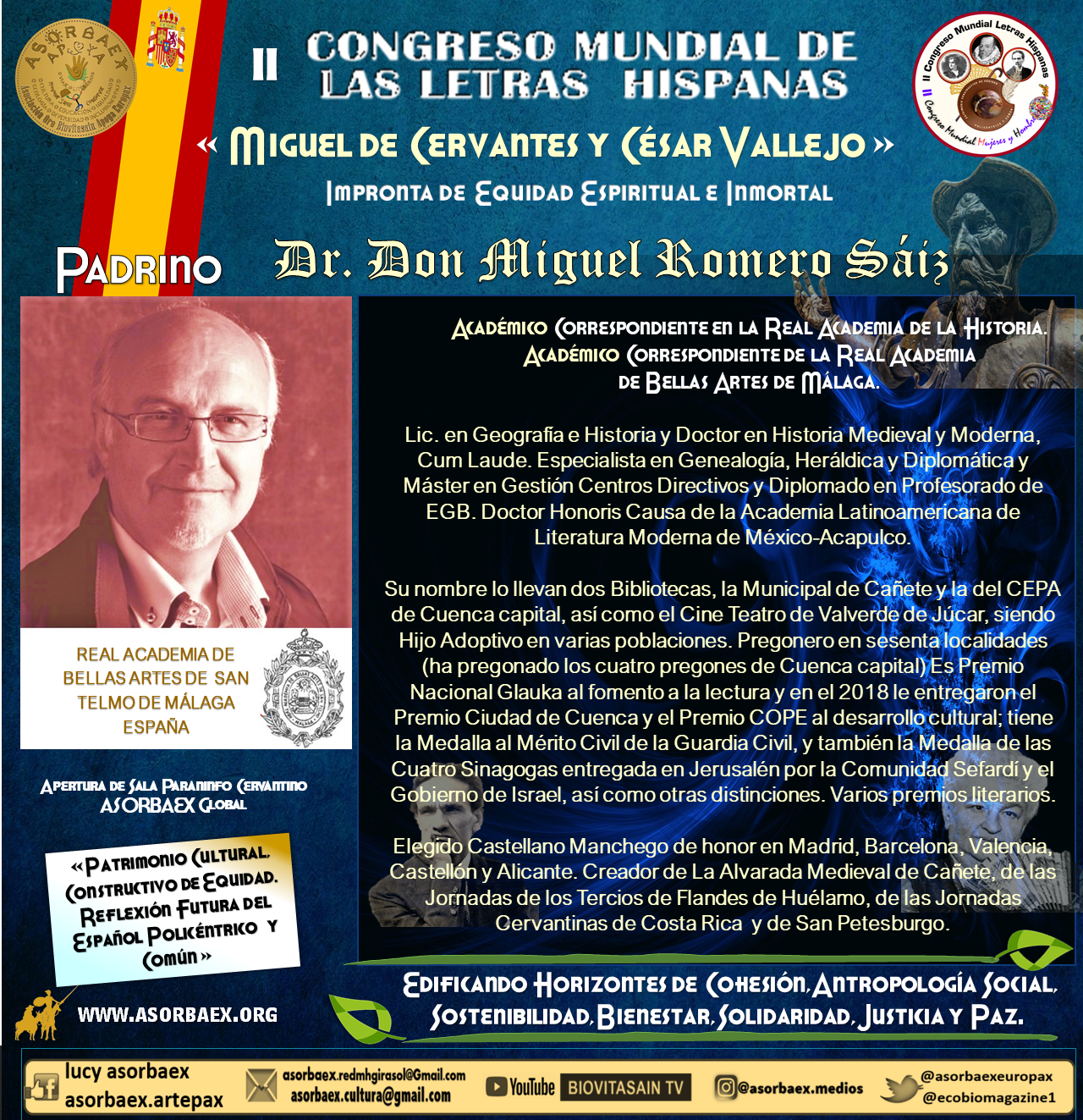 El Padrino del II Congreso Mundial de las Letras Hispanas «Miguel de Cervantes y César Vallejo» es el Dr. don Miguel Romero Sáiz, Doctor en Historia Medieval y Moderna, Académico Correspondiente de la Real Academia Española de la Historia y Académico Correspondiente de la Real Academia de Bellas Artes de Málaga.