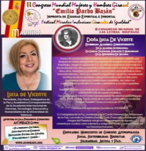 La Madrina del II Congreso Mundial Mujer y Hombre Girasol «Emilia Pardo Bazán» es doña Lucía de Vicente, periodista, escritora, Premio Vergara 2017, académica correspondiente de la Academia Internacional de Ciencias, Tecnología, Educación y Humanidades de la universidad de Valencia y Miembro del Capítulo Reino de España de la Academia Norteamericana de la Literatura Moderna Internacional.